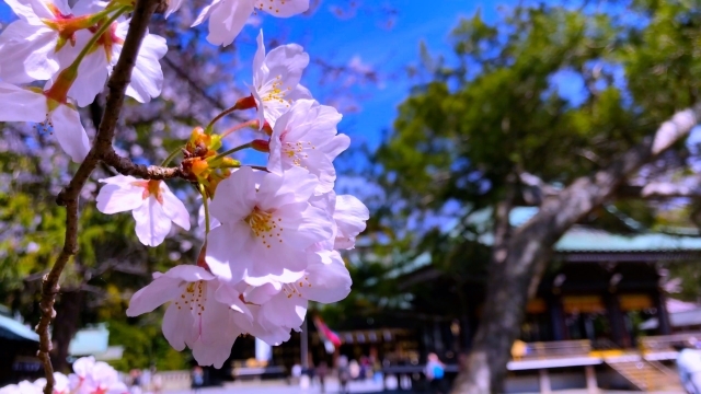 歴史ある社殿と桜の景色が調和するこの時期は、