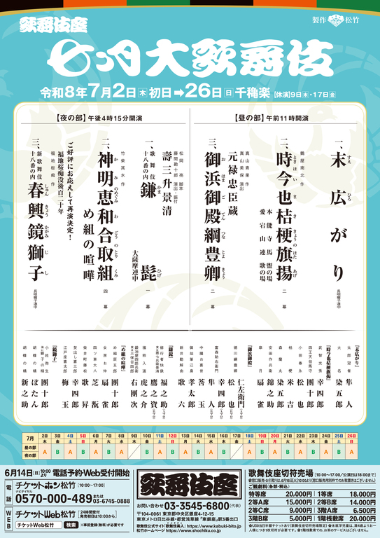 七月大歌舞伎 午前の部では、古典歌舞伎ならではの華やかさ、迫力、そして美しさを堪能できる演目がそろいました。物語の世界へ引き込まれる時代物、華麗な所作が魅力の舞踊、歌舞伎ならではの様式美など、初めてご覧になる方にもおすすめの内容です。午前開演のため、一日を有効に使いやすく、都心観劇にもぴったりです。