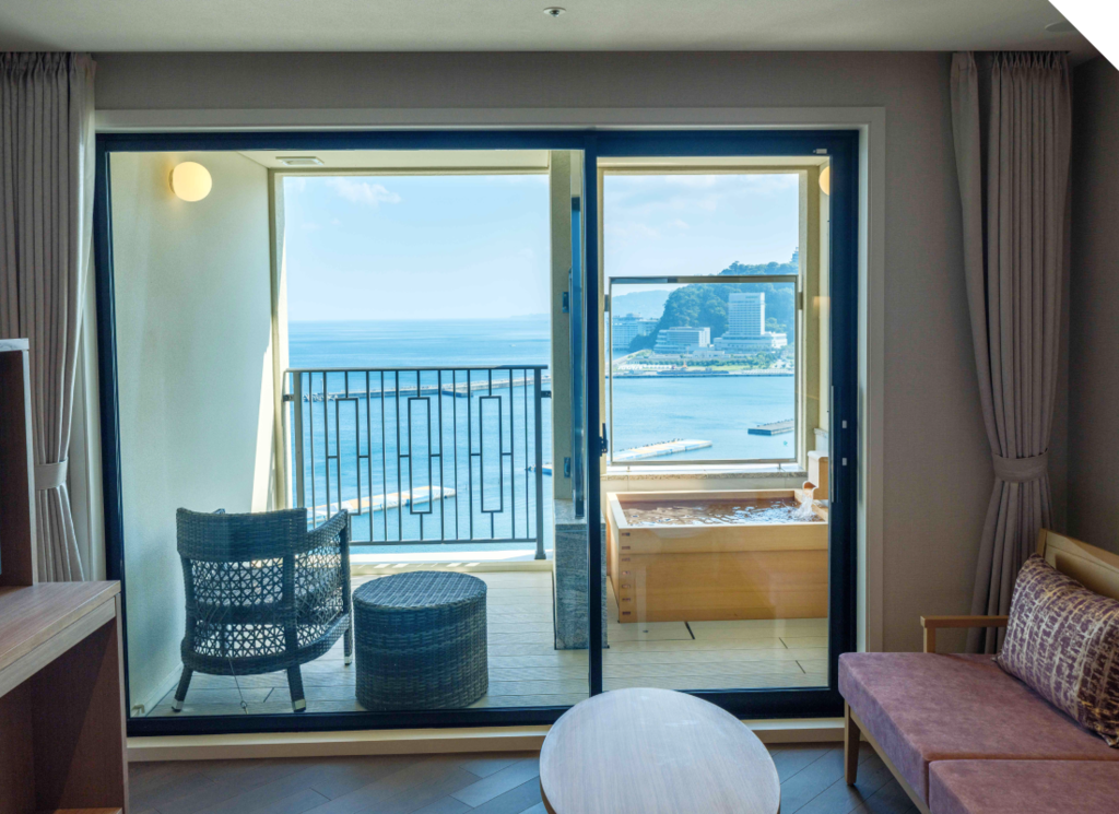 温泉露天風呂付き客室でくつろぎながら、熱海ならではの開放感あふれる景色とともに、上質なひとときをお楽しみいただけます。