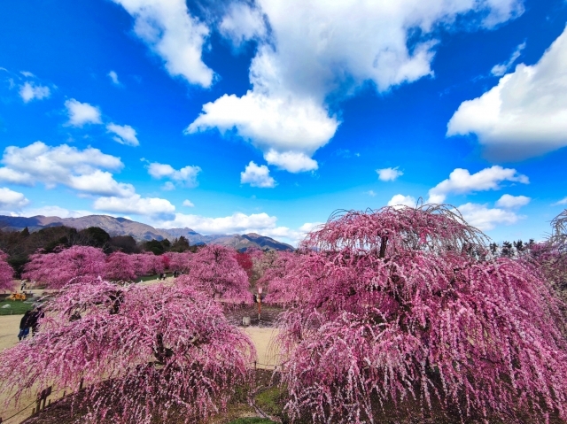 日本の伝統園芸文化のひとつであるしだれ梅の「仕立て技術」の存続と普及を目的とする研究栽培農園です。「呉服枝垂(くれはしだれ)」を中心に、匠の技と歴史が受け継がれた名木が約200本。鈴鹿山脈を借景に、桃色の大輪の花で彩られた早春の日本の美をご堪能いただきます。日本中から集められたしだれ梅と背景の鈴鹿山脈が合わさった風景は一度は見たい絶景です。