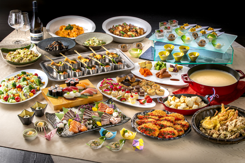 シェフが目の前で焼き上げるステーキや揚げたての天ぷら、彩り豊かな季節料理が並びます。