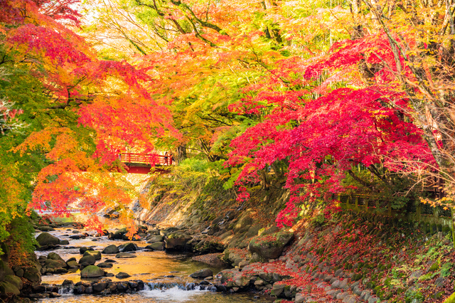 「伊豆の小京都」とも呼ばれる修善寺温泉街。紅葉シーズンには竹林の小径や桂川沿いの楓が鮮やかに色づき、しっとりとした和の風情を楽しめます。