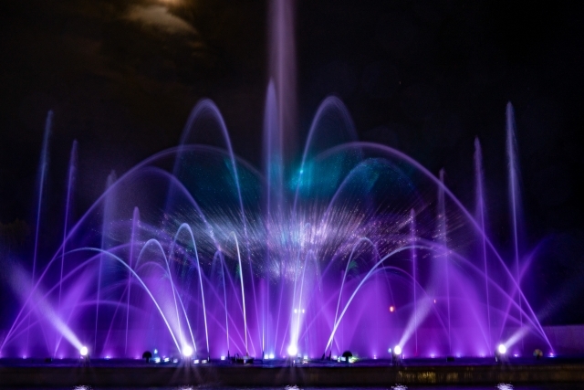 「王宮の丘」では、約10万球ものLEDが輝き、水と音がシンクロするダイナミックな噴水ショーを鑑賞できます。夜空を染めるカラフルな光と水のアートは、思わず息をのむ美しさ。